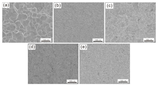 refers to the density of distilled water at test temperature, g/cm3; m1 is the weight of the sample in air, g; m2 and m3 are the wet weight and floating weight of the sample in distilled water. The samples were polished and polished prior to testing and washed and dried in alcohol with ultrasound. In Equation (2),