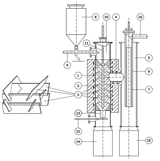 The scheme of a pilot unit for the sublimation of arsenic sulfides and the simplest-to-manufacture assembly of inclined surfaces, i.e., plates assembled in the form of a vertical shaft, are shown in Figure 2. The unit is a sublimator (1) heated with an electric furnace (2) with a shaft inside formed from a pair of plates with inclined slots. These slots have an angle (to the horizon) greater than the angle of the natural slope of the bulk material. The plates in pairs form a gap between themselves and the lower pair of plates so that the bulk material pouring out at an angle of natural slope does not “flow” from the upper edge of the lower plates. The sublimator is connected to a water-cooled condenser (5) with the help of a heated steam line (4). A water-cooled tube (6) with a fabric filter (7) intended to collect fine condensate is coaxially mounted inside the condenser. The unit is equipped with a hopper (8) for raw materials and a vibrating loader (9) for feeding the latter to an intermediate vessel (10). The intermediate vessel is separated from the sublimator space by a movable hollow rod with a cone gate (11) with a thermocouple inside. There is a vibrating unloader (12) mounted below the sublimator. It forms a gate together with the bulk material in the mouth (13) that separates the receiving hopper residue from the processing (14) from the sublimator. Arsenic sulfides crumbling from the condenser walls accumulate in the hopper (15). The gases are evacuated from the apparatus through a vacuum conduit (16).