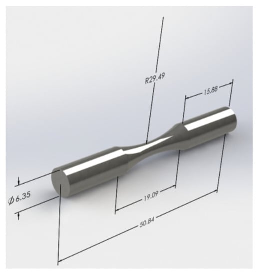 The geometry of the specimen, designed with SOLIDWORKS, is shown in Figure 6. The solid was meshed using tetrahedral elements; 16,513 nodes and 7645 elements were used to determine numerically the stress intensity factor (K) in order to predict the behavior of fatigue crack growth and estimate its useful life under aerated conditions and in a corrosive environment. Cracks with different size dimensions, determined from experimental tests on the geometry, were achieved. In the numerical analysis, they were also taken as boundary conditions: loads (N), rotational speed (rad/s), and material fatigue properties. Once the cracks of different sizes had been achieved, we sought to determine the stress intensity factor that exceeded the fracture toughness (KIC) of the material in order to visualize corrosion fatigue degradation.