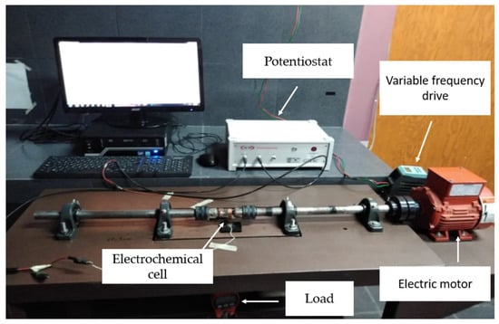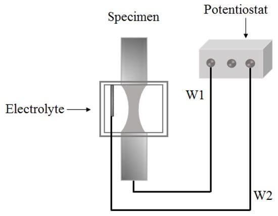For the corrosion fatigue tests, a corrosion measurement cell was used that was designed and fabricated with an inert material, i.e., polymethyl methacrylate and epoxic resin. The cell had a capacity of 40 mL; it was filled with a 3 wt.% NaCl solution at 90 °C. Figure 3 shows the electrochemical cell array for the measurement of potential electrochemical noise. The array featured three electrodes: the working electrode (AISI 410 SS) and two platinum electrodes as references.