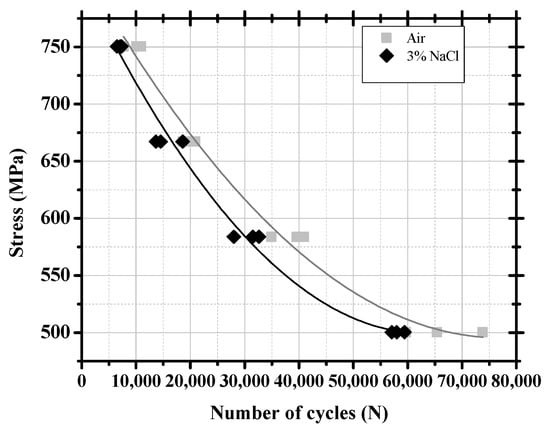 The stress vs. cycle number (S-N) curves were obtained in immersed and aired specimens, as shown in Figure 7. According to the obtained results, the fatigue resistance of the steel exposed to NaCl at 3% was reduced because of localized corrosion which was a consequence of the chloride ions that penetrated the surface of the material, causing the rupture of the passive layer of the surface of the specimen in some areas. Additionally, the mechanical load weakened the structure of the AISI 410 stainless steel. A passive layer was generated in some areas of the material but was mechanically damaged because of the fatigue load. A reduction of the lifespan of the specimen exposed to sodium chloride was also observed compared to that of the samples that had not been submerged in the solution. Through linear adjustment of the experimental data, the ratio of lifespan to fatigue in a corrosive and aired environment was determined: