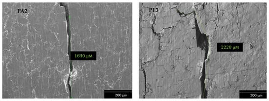 The life prediction relative to fatigue was determined analytically through the a-N curve. Using this method, it is possible to determine if the blades can still operate even though there are cracks. By knowing the growth rate of cracks in blade materials, such blades can remain in service as long as the cracks do not surpass the critical size (ac) [20,21]. In order to produce a crack growth curve, it was necessary to subject the cracked PA2 and PE3 samples to cyclic loads of constant amplitude of 750.6 MPa; the two cracked specimens are shown in Figure 8. The data for the growth of a crack of constant amplitude (Δσ) are shown in Figure 9. The length of the crack (a) was determined relative to the corresponding cycle number (N) in which the crack was measured, obtained from experimental data for each specimen exposed to immersion and an aired environment. As shown in the a-N curve, a bigger propagation of crack occurred and a reduction in the number of cycles was observed for the specimen exposed to the NaCl solution. The loads on the tip of the crack and the pits caused the damage accumulation to be much greater once the crack had been initiated.