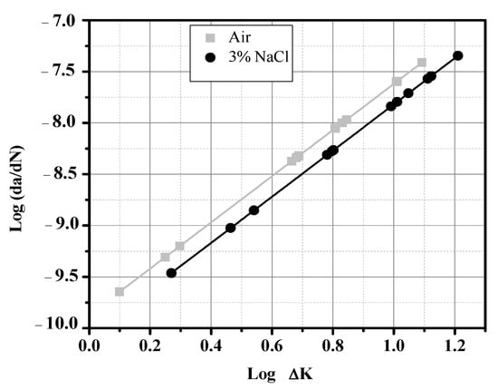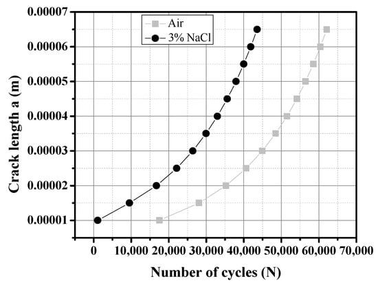 Data for the crack propagation speed evaluation were obtained under experimental conditions R = −1 y (σmax) = 750 MPa. Figure 10 shows that the fatigue crack growth in a corrosive environment was bigger than that in aired conditions because, with each increase in mechanical load, a new surface was exposed to the NaCl solution, resulting in the accumulation of damage with each cycle and a reduction in the lifespan of the specimen.
