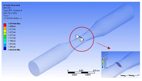 The stress intensity factor (K) was determined analytically and numerically along the cracks, as shown in Figure 11. The critical K was obtained based on the fracture toughness (KIC). The obtained stress intensity factor range (ΔK) was used to predict the behavior of crack growth due to fatigue/corrosion fatigue. Figure 12 shows (K) vs. crack length with stress values σ = 750 MPa, 667 MPa, 583 MPa, and 500 MPa in air and NaCl [22,23].