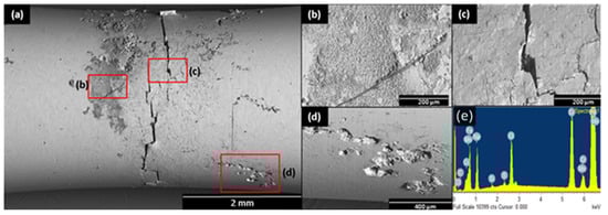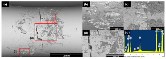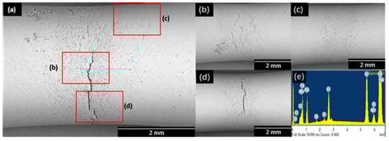 Evaluation of the corrosion fatigue of AISI 410 SS during cyclic stress in NaCl up to 500 MPa. (a) Crack in the neck of the sample, (b) End of crack, (c) Localized corrosion, (d) Corrosion pitting on sample surface, (e) EDS of corrosion products.