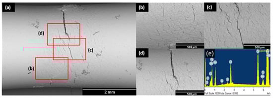 Figure 13c and Figure 14c show the cracking of the material due to the mechanical load and exposure of the corrosive medium. This was attributed to the localized attack of the aggressive medium in areas of the material where there was a concentration of stress, such as pits or ends of cracks, where intense attacks occurred, i.e., in anodic (dissolution) and cathodic (reduction) zones. On the other hand, Figure 13b,d show the corrosion products derived from the sodium chloride solution (protuberances and lighter areas), i.e., metal oxides. Figure 14d shows localized corrosion confined to an area in the form of cavities; the main cause of this was the rupture of the passive layer on the surface due to the presence of aggressive species and the concentration of chloride ions [24].