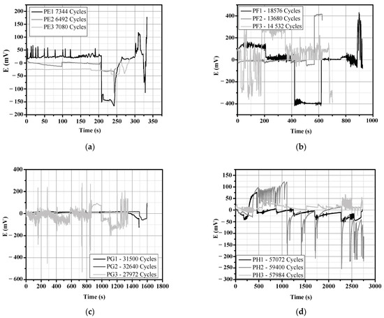 Time series of the electrochemical potential noise for AISI 410 SS exposed to a 3% NaCl solution under maximum stress of: σmax = (a) 750 MPa (90 % Sult); (b) 667 MPa (80% Sult); (c) 583 MPa (70% Sult), and (d) 500 MPa (60% Sult), with load frequency f = 20 Hz y R = −1.