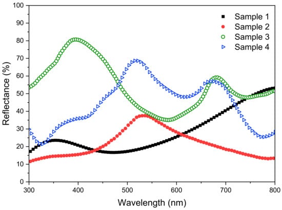 Among the reflectance spectra, Samples 1 and 2 have a relatively low reflectance below 30% in most of the wavelength range. Sample 3 shows the highest reflectance value which is above 35% in the whole range and up to 80% at 400 nm. The reflectance of Sample 4 is also very high within the range of 420~700 nm. It can be seen that both Samples 3 and 4 exhibit high reflectance, and their surface structures are formed under the irradiation of a lower laser wavelength (520 nm). In contrast, laser processing with a 1040 nm wavelength leads to a relatively lower reflectance and also obvious iridescent colors. Therefore, such laser processing conditions are suitable for preparing eye-friendly markings, especially for stainless steel surfaces [].