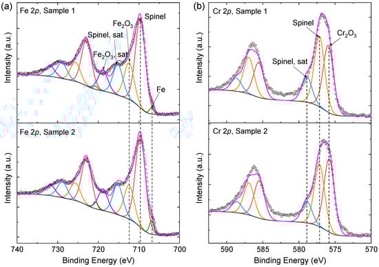 XPS spectra of the steel samples after laser processing. (a) Fe 2p spectra; (b) Cr 2p spectra. The identified species were marked for 2p3/2 peaks.