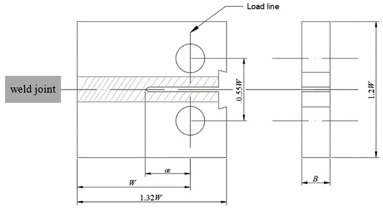 The as-received material in this study was commercial pure titanium grade 2 (TA2) with annealing treatment. Its chemical composition (mass fraction, %) is listed in Table 1. Table 2 shows the detailed welding parameters. The welding direction was normal to the rolling direction, and subsequent 100% radiographic testing (RT) was conducted to avoid macro cracks. Standard compact tension (CT) specimen was used in this study. The detailed dimension of the specimen is shown in Figure 1, where a0, B, and W are 20 mm, 12.5 mm, and 50 mm, respectively. Fatigue crack growth tests were performed on the MTS370 material testing system according to ASTME 674-15 [19]. Prior to the experiment, a crack with a length of 2 mm was produced. The crack length was recorded using the unloading compliance method during the tests. Triangular and trapezoidal waveforms with a constant frequency of 5 Hz were used. Dwell is applied at the peak load. In order to compare the effects of dwell temperature, FCG experiments are carried out at a room temperature of 25 °C and an intermediate temperature of 200 °C, as shown in Table 3.