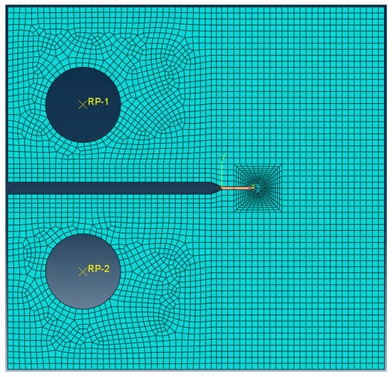 In order to carry out the cycle-by-cycle simulations, a finite element model of a standard CT specimen is created using the commercial finite element software ABAQUS, as shown in Figure 3. The meshing type is Continuum 4-noded plain strain element (CPE4R). The stress–strain gradient is imitated by refining the elements near the crack tip. The number of elements is 5535. In order to prevent hourglass modes, the enhanced hourglass control method is also used. As consistent with the test conditions, fixed constraint and cyclic load are applied in the top rigid pin and the bottom rigid pin, respectively.