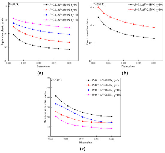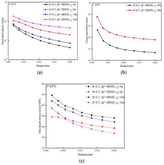 In order to investigate the role of room-temperature creep on the FCG behavior of the TA2 weld joint, the strain and stress distributions ahead of the crack tip after 50 cycles are plotted in Figure 6. According to the variation of Mises stress in Figure 6c, it can be found that the stress level around the crack tip is decreased by creep stress relaxation at load ratios of 0.1 and 0.7. Figure 6a shows the distribution of equivalent plastic strain near the crack tip, from which it can be observed that although creep stress relaxation occurs, equivalent plastic strain is increased under the loading condition of dwell because of the facilitating effect of creep on the plastic deformation of the crack tip. Figure 6b shows the distribution of creep strain near the crack tip. At a low load ratio of 0.1, the value of creep strain is quite small, which has little impact on crack growth. As the load ratio increases to 0.7, creep strain increases significantly. At this condition, the facilitating effect of room-temperature creep on FCG behavior cannot be ignored.