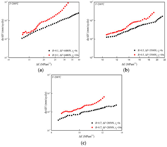 At a temperature of 200 °C, creep significantly promotes fatigue crack propagation at different load ratios, leading to a more prominent dwell sensitivity than that at room temperature, as shown in Figure 7a–c. In addition, the promotion effect of creep on the FCG rate is more prominent at higher load ratios. With the propagation of the FCG behavior, the stress level near the crack tip increases, leading to a more significant effect of creep on the FCG rate in the later stage, which is consistent with the result in Figure 4. The medium-low–temperature creep behavior of α titanium is dependent on the applied stress level and temperature [17,23], as the increase in temperature and stress level is beneficial for the cumulation of creep strain. With the increase in temperature, the threshold stress for the activation of dislocation slip decreases [23], which facilitates the generation of creep deformation, leading to a more significant creep effect in the TA2 weld joint at 200 °C.