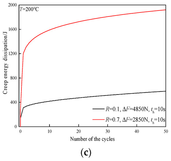 Figure 8 shows the variation of different strain energy components for the TA2 weld joint at a temperature of 200 °C. At this temperature, plastic strain energy is decreased by the prominent creep effect at different load ratios, as shown in Figure 8a,b. Creep strain energy in Figure 8c is much higher than plastic strain energy, indicating that the FCG behavior at this condition is mainly controlled by creep. As a result, the FCG rate can be significantly increased by creep at a temperature of 200 °C.