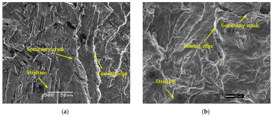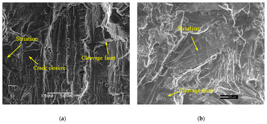 Figure 10 shows the fracture surface for specimens with and without room-temperature dwell at the load ratio of 0.1. In Figure 10a, smeared fracture features resulting from crack closure can be observed, which disappear at the loading condition of room-temperature dwell. The absence of a crack closure feature in Figure 10b is due to the application of dwell at the maximum load, which is effective in avoiding crack closure. As a consequence, the FCG rate can be increased by room-temperature creep in the near-threshold stage, as already shown in Figure 4. Except for this, other features displayed in the fracture surfaces with and without dwell are similar, which can be characterized by massive fatigue striations and few cleavage facets, exhibiting fatigue characteristics of linear elastic fracture. Therefore, the application of dwell at a load ratio of 0.1 and a temperature of 20 °C has little influence on the FCG rate in the stage of stable crack growth.