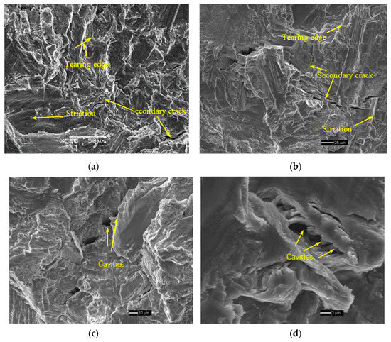 At a load ratio of 0.7, the corresponding fracture morphologies of TA2 under pure fatigue and creep–fatigue loading conditions are displayed in Figure 12a–d, respectively. Distinct differences can be found between the microstructures in Figure 12a,b. The most remarkable difference in the microstructures after the creep–fatigue process is the appearance of cavities, as shown in Figure 12c. According to the enlarged view in Figure 12d, the diameters of the micro-cavities are approximately 10 μm. The increase in load ratio facilities the formation of these cavities. Various defects, such as pores and slags, are easily formed during the welding process. These initial defects tend to evolve into cavities under the loading condition of high load ratio and dwell, as the enhanced plastic deformation resulting from creep around these defects expands the size of the initial defects. A previous SEM study on the TA2 base metal failed to find the existence of cavities under the loading condition of high load ratio and dwell [15], as the microstructure of base metal did not provide the initial defects, favoring the formation of cavities during the subsequent FCG process. In Figure 12c, the appearance of a cleavage facet is consistent with reference [25], which is evidence of a dislocation-related creep mechanism. Overall, compared to that at a lower load ratio, an apparent difference of the feature in the fracture surface at a load ratio of 0.7 is detected, including the longer secondary crack, rougher fracture surface, and the appearance of cavities. From the above analysis, it can be concluded that the application of dwell at a load ratio of 0.7 has a certain influence on the fracture morphology, leading to the increase in the FCG rate in the stable growth region. However, as the room-temperature creep of the TA2 weld joint is limited, the increase in the FCG rate is relatively small.