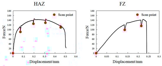 - Scanning points were set on the load–displacement curve of the HAZ and the weld obtained in step (1). The sample was loaded to the corresponding scanning point, loading was stopped, and then 3D CT scanning of the sample was conducted. The X-ray tomography equipment was an Xradia 620 versa high-resolution three-dimensional analysis experimental platform, and the scanning parameters were set as follows: a total of 2985 projection images were collected for each scan. The scanning duration was 90 min, and the voxel size of the scanned image was 2.0194 × 2.0194 × 2.0194 μm3. The loading curve is shown in Figure 5.