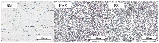In this study, a VH3100 Vickers hardness testing system (Buehler, Lake Bluff, IL, USA) was used to test the hardness of the metallographic samples. The test area was passed from one side of the base metal area through the HAZ and the FZ to the other side of the base metal area. The distance between the scan line and the bottom was about 0.8 mm, the distance between the adjacent indentations was about 0.8 mm, the dwell time was 10 s, and the loading force was 10 kgf.