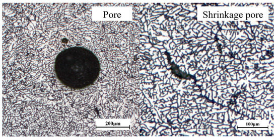 The macro-morphology and defects of the welding area are shown in Figure 8 and Figure 9. The defects in the weld were divided into two main types: (1) Pores, where most of the pores presented as elliptical or oval shapes, as shown in Figure 9, which is a typical metallurgical pore morphology [17]. During the welding process, due to the sharp drop in temperature, supersaturated hydrogen cannot be separated from the molten pool, and thus, circular or elliptical pores are formed in the FZ. Pores are the most common casting defects in aluminum alloys, and their size and distribution are greatly affected by the solidification speed of the molten pool and the floating rate of hydrogen in the molten pool [18]. The higher the solidification speed, the harder it is for supersaturated hydrogen to escape. When the floating speed of hydrogen is less than the solidification speed of the molten pool, the supersaturated hydrogen will eventually stay in the molten pool to form pores [19,20]. (2) Shrinkage pores, which were irregularly shaped cavities formed due to different temperature gradients in different areas of the weld during cooling, as shown in Figure 9. Compared with the usual spherical pores, the shrinkage pores have an irregular 3D shape, which is more likely to lead to stress concentration, and thus, the shrinkage pores have a greater impact on the mechanical properties of welded joints.