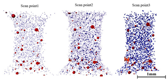 CT is currently the key technology for studying the damage evolution behavior of materials, which can non-destructively characterize the microstructure of materials. In the scan, we obtained a 3D rendering of the pores inside the specimen. The pores were classified into pores and shrinkage pores by using the “sphericity (f)” parameter. Figure 10 and Figure 11 show the 3D CT scanning reconstructed images of the HAZ and the FZ in the in situ tensile experiment. To reflect the sizes of the defects, red was used to more intuitively represent defects larger than 500 μm3 in the HAZ and larger than 5000 μm3 in the FZ. Scanning point 1 was the initial stage, that is, the stage when the sample did not deform before loading. By observing and comparing the imaging results of the same sample at different stages, with the accumulation of strain, the volume of some original defects in the sample continued to grow, new meso-defects formed in the sample, and then adjacent defects were combined into a larger defect, with new meso-defects forming in the sample.