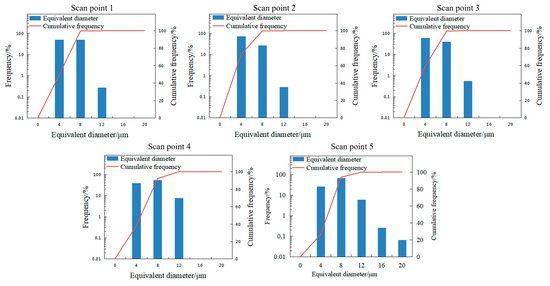 Figure 12 and Figure 13 show the frequency histograms and cumulative frequency curves of the equivalent diameters of defects in the HAZ and FZ, respectively.