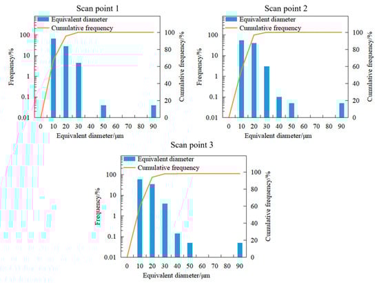 Frequency histogram and cumulative frequency curve of the equivalent diameter of alloy defects in different stages of the HAZ.