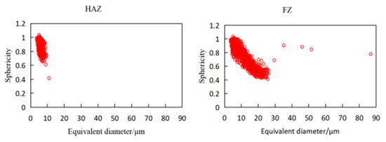 For the 5754 aluminum alloy CMT welding, the frequency of the defects with an equivalent diameter of less than 30 μm in the FZ of the AA5754O aluminum alloy CMT welded joints was as high as 90%, and the frequency of the existence of defects gradually decreased with the increase in the equivalent diameter in the same scanning stage. The frequency of occurrence of larger dimensions increases gradually with the equivalent plastic strain of the specimen. The frequency of defects with a defect equivalent diameter of 20~40 μm gradually increased with the accumulation of strain, while the frequency of defects larger than 40 μm did not change significantly. Figure 14 calculates sphericity and equivalent diameters of all defects in the HAZ and FZ. From Figure 14, it can be seen that the equivalent diameter was between 20~40 μm. Most of the defects were shrinkage cavities with sphericity less than 0.5. Due to the irregular shape of shrinkage cavities, they were more likely to polymerize and grow during the tensile process of the material, which led to material failure, making the elongation of the FZ significantly smaller than that of the HAZ.
