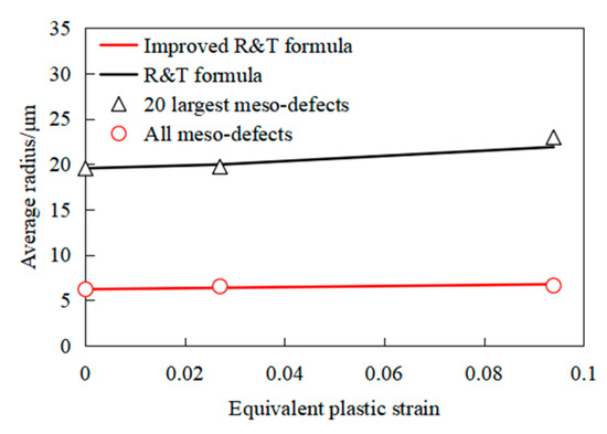 It can be seen from the figure that with the accumulation of plastic strain, the growth rate of the average radius of the 20 largest meso-defects was higher than that of all meso-defects, which was mainly due to the interaction between the growth behavior of the metal internal defects and the nucleation behavior of the defects. The research of Cao et al. and Bouaziz et al. showed that the defect nucleation behavior of metal materials can be fitted using various forms of functional equations [21,22]. Rice and Tracey proposed using the R&T formula to simulate the growth behavior of defects, which describes the growth of a defect radius r in an ideal plastic matrix [23,24,25]. The R&T formula is