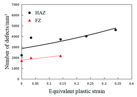 The improved R&T formula introduced the influence of defect nucleation, and thus, the number of defects per cubic millimeter N was measured in different areas of the sample, as shown in Figure 17. Since the number of microscopic defects increased exponentially with the occurrence of damage, an exponential function was used to fit the changing behavior of the defect density. When the evolution of the defect number density N is known, the improved R&T formula is used to fit the growth behavior of all detailed defects in the FZ and HAZ. By fitting the improved R&T formula, αRTm and R0 were 6.2 and 2 in the HAZ and 5.31 and 7 in the FZ, respectively. The fitting curve is shown by the red curve in Figure 13 and Figure 14, where the R-squared values are 0.91 and 0.82, respectively. The improved R&T model can describe the variation process of the mean radius of each mesoscopic defect in the sample well and can be used to predict the evolution of the mean radius of each mesoscopic defect in the sample.