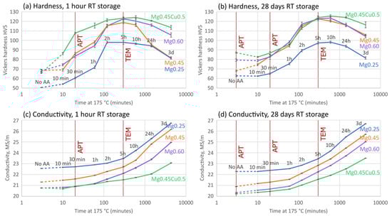 Aging curves after 1 h/28 days RT storage and subsequent AA. (a,b) Vickers hardness, averaged over 5 measurements. Error bars show standard errors. (c,d) Electrical conductivity, averaged over 5 measurements. Errors are too small to show in this plot.