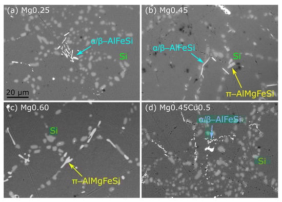 To observe how chemical elements are utilized at the micrometer scale, SEM images were acquired from the peak aged conditions, as seen in Figure 3. Phases were identified using EDS and were subsequently easy to classify due to differences in shape and atomic number contrast. As seen previously in Figure 1, the microstructure is dominated by eutectic Si particles that have been rounded in the course of homogenization/SHT. The brighter particles are Fe-containing, in most cases α or β phases. We do not distinguish these as they contain the same elements and are not relevant to the later characterization. However, as more Mg is added to the alloy, the π phase appears, which locks in some Mg, that cannot be used to form precipitates. The effect of this will be evaluated in Section 4. No Cu-containing phases were observed, and no β–Mg2Si was observed. In alloy Mg0.45Cu0.5, which is slightly enriched in Mn, a few dispersoid-sized α particles are observed.