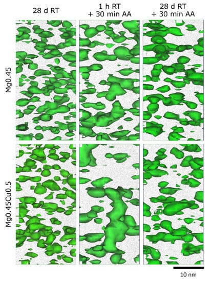 APT subvolumes (20 × 20 × 40 nm3) of alloys Mg0.45(Cu0.5) with 28-day RT storage and/or 30 min aging at 175 °C. The 1.5% Mg concentration isosurfaces are shown (green) with Al atoms (gray).