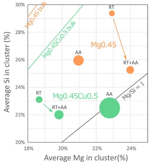 The results of MSM cluster analysis on the six volumes are presented in Table 3. Values are given as averages over all identified clusters. As seen in the standard deviations (in parentheses), the distributions of the measured values are broad. The variation in the averages between the conditions are however of sufficient magnitude that some trends can be discerned. These are best seen in Figure 5, where average cluster compositions and sizes are shown. Starting with the RT storage conditions, clusters are small, and Cu addition only has the effect of substituting clustered Mg and Si with Cu and Al. For the AA conditions, Mg0.45 has an average Mg/Si ratio of 0.8, while its Cu-containing equivalent has 1.0, concurrent with larger and more developed clusters.