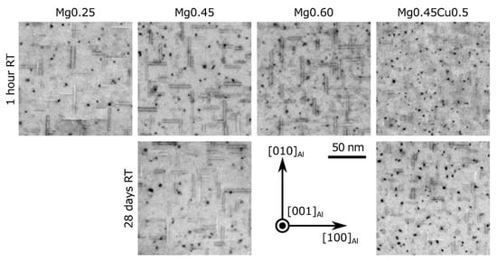 Figure 6 shows LAADF-STEM images from all four alloys at peak hardness (5 h at 175 °C), for 1 h and 28 days of RT storage before AA. The images are Gauss filtered and inverted in contrast for visibility. Needle-shaped precipitates growing along [001]Al appear as dark dots, while precipitates growing along [100]Al and [010]Al appear as lines with double interface strain contrast. The images are acquired for areas with similar specimen thicknesses. It is clear that the precipitate density at peak hardness increases when the Mg content is changed from 0.25% to 0.45%. Additions of Cu also produce more numerous and shorter precipitates, to the point where they become difficult to discern from the surrounding matrix. Small Si plates are known to sometimes precipitate in high-Si alloys [49,50] but were not observed in this study. Beyond these observations, quantitative results are required for revealing more subtle variations.