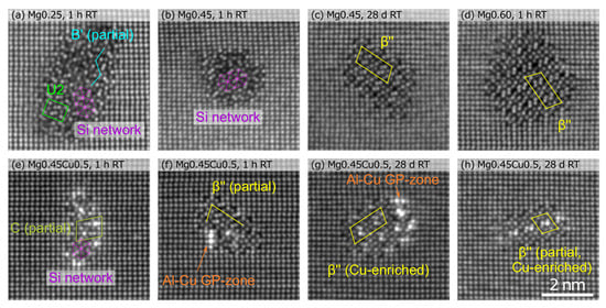Alloy Mg0.45Cu0.5 hosts precipitates containing Cu-rich columns, which appear bright in HAADF-STEM images. The same types of precipitates are found here: β′′ and disordered variants. In addition, there are fragments of phases from the Al–Mg–Si–Cu system such as Q’ and C [38] observed in Figure 7e and Cu walls/Al-Cu GP-zones [51] observed in Figure 7f,g. The structures appear very similar to earlier images from a similar alloy and treatment [49].