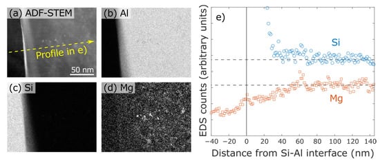 To investigate the influence of Si particles, a TEM sample was made that contains parts of a Si particle and its interface with an Al grain. An EDS map was acquired across the interface and is presented in Figure 8. Precipitates in the Al matrix are visible in the Mg map in Figure 8d, except within the first 50 nm or so from the interface. The concentration profile in Figure 8e shows that Mg is depleted and Si is enriched close to the Si particle, but the concentration stabilizes to a bulk level around 80 nm from the interface. This is comparable to typical precipitate-free zones around grain boundaries in Al–Mg–Si alloys [52]. The density of precipitates was also evaluated qualitatively at various distances from Si particles (see Supplementary Material [43]), and no apparent differences were found from the areas investigated so far, which are typically 5–10 µm away from the nearest Si particles.