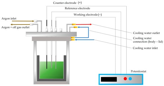 After that, the respective electrolytes (83.33 wt.% NdF3 + 16.66 wt.% LiF and 61.10 wt.% NdF3 + 26.3 wt.% PrF3 + 12.60 wt.% LiF) were mixed with the ground MRDO inside a carbon crucible. The counter electrode (CE) consists of a glassy carbon rod (EWG 99.95%, 4 mm diameter), the working electrode (WE) was made of molybdenum (EWG > 99.95%, 2 mm diameter), and the reference electrode (RE) was made from tungsten (2 mm diameter, EWG 99.95%). The potential of the WE was measured relative to the RE in the melt under given conditions. The electrodes were polished with SiC emery paper and then consecutively rinsed with deionized water and ethanol to remove any impurities before being inserted into the cell using Swagelok connections in the lid and alumina tubes to separate the sealing from the heat. Notably, 1.5 cm of the electrode′s body was submerged in the electrolytes. To keep dangerous gases from escaping the cell during the experiments, the cell was covered with a water-cooled, gas-tight lid with Swagelok connections. To get the cell to the process temperature of 1050 °C in the electrolyte, the crucible containing electrolyte was placed inside a resistance-heated furnace and heated up to the temperature set in advance. A thermocouple Type B connected to a Swagelok connector was used to measure the temperature. To keep the melt from coming into contact with air, a 1.5 L/min continual argon flow purged the system. The exhaust system was used to treat the off-gas after it was moved into washing bottles filled with water and NaOH. An illustration of the electrolysis setup is shown in Figure 1. To avoid damage to the rubber sealing in the reactor’s lid, water cooling system was provided to cool the upper part of the cell.
