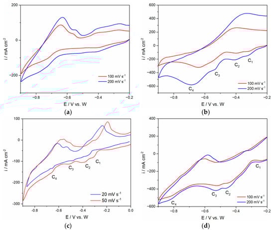 In the voltammograms obtained from the E-4 electrolyte, as illustrated in Figure 2d, the potential was scanned starting from initial potential, Ei = −0.20 V in a negative direction to the final cathodic end potential of EC = −0.90 V vs. W, with different scan rates. From the voltammograms, it can be seen that at least three redox processes are better defined than the rest. Moreover, with increasing amounts of MRDO in the electrolyte, a shift in the reduction peaks of C4 toward the more negative values was observed. For example, the cathodic peak C4 in the electrolytes with 3 and 4wt.% of MRDO was observed at ≈−0.70 V, and in the electrolyte with 6wt.% of MRDO at ≈−0.80 V. The peak potential values slightly deviate from the values obtained in Cvetkovic’s study but still remain in the range. It seems that the presence of different content of the MRDO in the electrolyte causes changes in the cathodic current density but did not significantly influence the position of current peaks on the voltammograms.