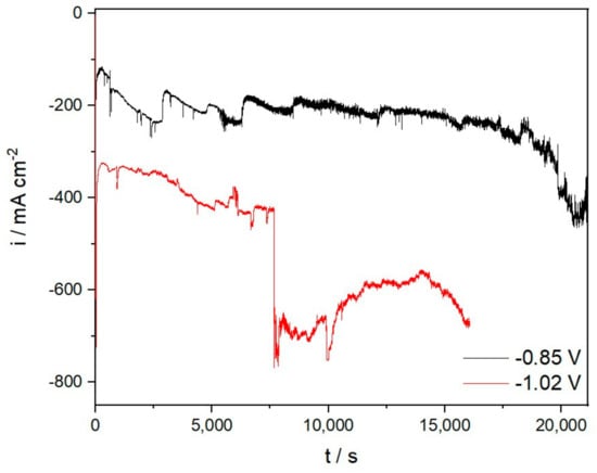 Potentiostatic deposition on Mo cathode from E-2 (−0.85 V) and E-4 (−1.02 V).
