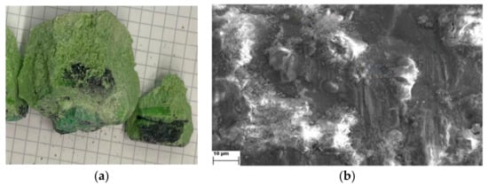 Deposited metal could not be directly seen on the cathodes investigated immediately after the deposition due to the coating of a solidified electrolyte on it. After the deposition, the solidified electrolyte from the crucible was then cracked open in search of metal droplets, but to no avail. However, dark black patches can be seen at the bottom of the electrolyte E-4 block, close to the bottom of the crucible, Figure 4a. This was not observed in electrolyte E-2 when, after the deposition, the solidified electrolyte was cracked. A conjecture here is such that the input MRDO was not able to dissolve within the electrolyte and sediment at the bottom of the crucible. This type of behavior has been observed previously in similar investigations []. It was said that the insoluble rare earth oxides and rare earth oxyfluoride due to their higher specific gravity of the electrolyte are distributed in lower parts of the electrolytic cells []. Another possible reason for the appearance of those black patches at the bottom of the crucible could be the limitations of REO dissolution in fluoride-based melts. Further origin of those black patches may be the existence of thermal screens/shields preventing proper temperature distribution inside the reactor and in the measuring crucible. Too low temperatures (wrong thermal zone and gradients) could cause a decrease in the dissolution of REO obtained from recycled magnets. Literature reports that REO solubility in fluoride-based melts is limited, approximately to 3–5 wt.% []. Of course, the solubility increases at elevated temperatures, as was observed in the work of Sarfo et al. []. Based on our previous investigations, however, in similar fluoride (63.17 wt.% NdF3 + 20.96 wt.% PrF3 + 12.02 wt.% LiF) electrolyte and working temperature of 1050 °C, it seems that undissolved material from MRDO is settled at the bottom of the crucible. In this study, the input material, apart from rare earth oxides, contains a substantial amount of neodymium boron, iron neodymium, and dysprosium iron oxides, without indication of their solubility in this particular media. In addition, Figure 4b shows the SEM image of the electrode surface.