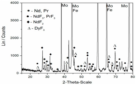 The characteristics of this XRD pattern in Figure 5 are very similar to those shown earlier in our previous investigation and confirm the applicability of the electrolyte composition used in the present work [,]. It is evident that the additional diffraction signals related to Fe are observed when MRDO is used in the based molten fluoride instead of pure REO. The results from this study, and our previous work, validated our choice of the electrolyte composition employed and the efficiency of the electrolysis process applied. Chemical and XRD analysis suggests that, under the applied conditions, Nd and Pr can be extracted in metal form from the electrolyte composed of NdFeB-based rare earth oxides present in the MRDO and corresponding rare earth salt. The results of this analysis confirmed the viability of using MRDO in the electrolysis as a part of fluoride molten salt electrolyte and established the route for recycling rare earth elements from used magnet scraps.