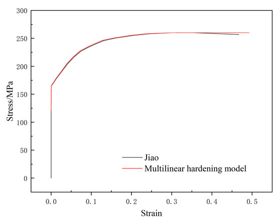 In the existing VFIFE study, there is only the bilinear hardening model and the power hardening model, which cannot accurately simulate the elastoplasticity of the materials. In order to accurately describe the strain state of the element under different stress states, a multilinear hardening model was used to discretize the material constitutive curve into multiple points, and the points were connected into broken lines. The elastic-plastic matrix under the state was updated according to the stress state of different load steps to accurately predict the elastic-plastic stress–strain of the material.