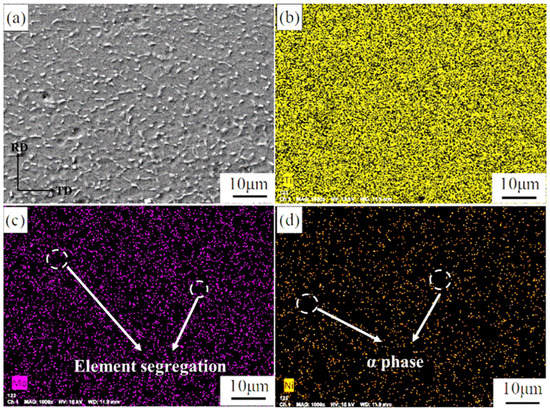 The surface scanning energy spectrum of TA10 alloy sheets annealed at 780 °C for 2 h (a) scanning surface, (b) Ti, (c) Mo, and (d) Ni.