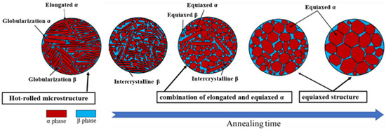 Luo et al. [11] studied transformation characteristics of temperature and phases within Ti-6Al-4V (TC4) aeroengine drum in hot forging and air-cooling procedures. It shows a simple and effective modeling approach to predict the transformation characteristics of temperature and phases during TC4 drum hot forging and air-cooling processes. Davari et al. [12] studied the effects of annealing temperature and quenching medium on the microstructure, mechanical properties, and fatigue behavior of TC4 alloy. The results show that with the increase in annealing temperature, the length, width, and volume fraction of the primary α phase decrease significantly, and the contents of the transformed β phase and residual β phase increase significantly. In addition, the α colony size and effective slip length decrease significantly, leading to an increase in hardness and tensile strength. Wang et al. [13] studied the microstructure evolution and static recrystallization of the hot-rolled Ti-6Al-2Zr-2Sn-2Mo-1.5Cr-2Nb (TC21) titanium alloy with equiaxed structure during annealing. The results show that uniform and fine microstructure can be obtained for hot-rolled TC21 titanium alloy when the annealing temperature is 880 °C. Vrancken et al. [14] studied the heat treatment structure and mechanical properties of TC4 prepared by selective laser melting and found that the effects of several heat treatments on the microstructure and mechanical properties of laser sintering TC4 were studied. The effects of these treatments on the hot forging and subsequent rolling annealing of the original equiaxed TC4 were compared.
