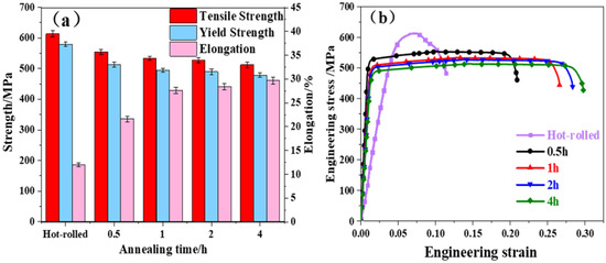 Figure 8a shows the tensile strength, yield strength, and elongation of TA10 alloy sheets at different annealing times. It can be seen from Figure 8 that the tensile strength of the sample annealed at 780 °C for different annealing times is lower than that of hot rolled, but the plasticity is higher than that of the hot rolled state. With the increase in annealing time, the tensile strength decreases, and the plasticity increases gradually. The reason for this phenomenon is because of the increase in annealing time; the recrystallization driving force is further enhanced. So, the degree of recrystallization is enhanced. The microstructure is equiaxed α phase. Compared with the microstructure of hot-rolled, the microstructure becomes more uniform and compact, the grain is more complete, and the degree of work hardening is eliminated to a certain extent. Figure 8b shows the stress–strain curves of TA10 alloy at 780 °C for different annealing times. The true stress–strain curves of all TA10 alloys show the characteristics of elastic-plastic stress–strain curves. Elastic deformation occurs first, and there is the obvious yield on the curve, and then uniform plastic deformation occurs under continuous external force loading. The tensile strength of specimens obtained from different annealing processes is lower than that of the hot-rolled state, while the plasticity is obviously improved, in which the elongation increases from 12.0% to 29.7%. With the extension of the annealing time, the strength decreased, elongation increased, and plasticity increased. The reasons are that the equiaxed α structures of the annealed sheets become more uniform and denser, the grains are more complete, and the internal stress is eliminated [12,22]. Through the analysis of comprehensive performance, when annealed at 780 °C for 2 h, and the tensile strength, yield strength, and elongation are 527.28 MPa,495.7 MPa, and 28.4%, respectively.