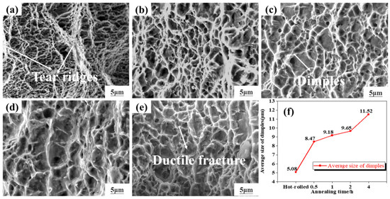 Fracture morphology of TA10 annealed sheets: (a) hot-rolled, (b) 0.5 h, (c) 1 h, (d) 2 h, (e) 4 h, and (f) average size of dimples.