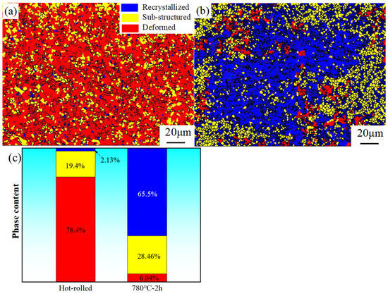 In order to investigate the recrystallization, grain boundary, and texture changes of the sheets after annealing treatment, the hot-rolled sheets and the best annealing time (2 h) were characterized by the EBSD test. Figure 11a,b show the recrystallization diagram of TA10 alloy sheets after hot rolling and annealing treatment. In these figures, blue is the fully recrystallized crystal nucleus, yellow is the substructure, and red is the deformed matrix. It can be seen from Figure 11a,b that after annealing, the recrystallized crystal nuclei and substructures of the sheets are significantly increased, and the deformation matrix structure is significantly reduced. Figure 11c shows the proportion of recrystallized crystal nucleus, substructure, and deformed matrix. Figure 11c shows that the recrystallized nuclei of hot-rolled sheets increased from 2.13% to 65.5%. The substructures of hot-rolled sheets increased from 19.4% to 28.46%. The deformation matrix structure of hot-rolled sheets decreased from 78.4% to 6.4%. After annealing at 780 °C for 2 h, the deformation matrix structure of the sheets disappeared, mainly consisting of recrystallized crystal nuclei and substructures. The reason for the recrystallization nucleation is that the recrystallization of TA10 alloy hot-rolled sheets occurred when the appropriate temperature and reasonable annealing time are reached in the annealing process, and the recrystallization driving force is strong under the annealing temperature and annealing time. During annealing treatment, a certain grain boundary penetrates into the grain with large residual strain, the deformation storage energy disappears, and many strain-free recrystallized nuclei are formed. Moreover, through the merger of grain boundaries or subgrain boundaries, a more recrystallized crystal nucleus is formed.