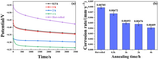 Figure 12a shows the curve of OCP of TA10 alloy sheet in 3.5% NaCl solution with time after different annealing times at 780 °C. As shown in Figure 12a, the trends of the OCP variability are similar for the TA10 alloys treated with different thermal processing processes. At the initial stage of the potential test, the OCP curves showed a positive trend and decreased rapidly. With the extension of the test time, the change rate of the OCP curves gradually slowed down until it reached a relatively stable state at last. The OCP curves changed to the positive direction in the initial stage, indicating that the titanium alloy was in an active state at this time. It can be seen from Figure 12a that the OCP curves of TA10 alloy treated by different annealing times have a similar trend. It takes about 500 s to reach the potential stability state, and the activation time is short. However, the potential after stabilization is significantly different. When the OCP reaches stability, the OCP of hot rolled TA10 alloy is −0.3574 V, and the OCP of the alloy is −0.2628 V when the annealing process is 780 °C × 4 h. The potential of the alloy at 780 °C × 1 h and 780 °C × 2 h is −0.3539 V and −0.2982 V. The results show that when the annealing process is 780 °C × 4 h, the corrosion resistance of TA10 alloy is better than others, and the corrosion resistance of the alloy in the hot rolling state is the worst.
