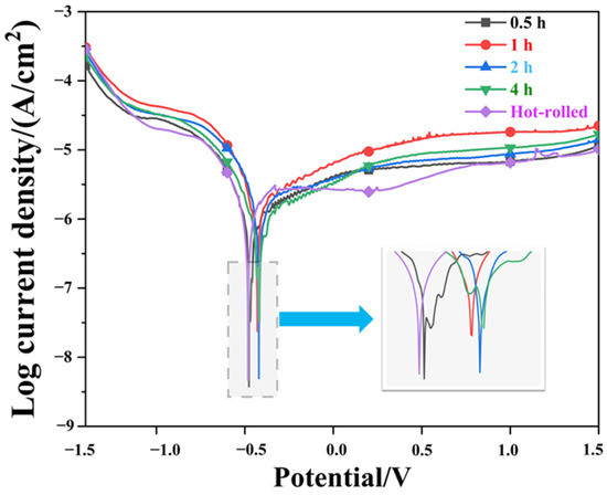 The corrosion rate of hot-rolled and TA10 alloy sheets with different annealing times (0.5–4 h) at 780 °C were calculated as shown in Figure 12b. It can be seen from Figure 12b that the corrosion rate of hot-rolled is the highest,0.00785 mm/y. When the annealing treatment was 780 °C × 0.5 h, the corrosion rate was 0.00672 mm/y. When the annealing treatment is 780 °C × 1 h and 780 °C × 2 h, the corrosion rates are 0.00493 mm/y and 0.00476 mm/y. The corrosion rate is the slowest when the annealing process is 780 °C × 4 h, which is 0.00409 mm/y. In conclusion, after annealing at 780 °C, the corrosion rate decreases gradually with the extension of the annealing time; this is because, with the prolongation of the annealing time, the grain size gradually increases, resulting in weakened intergranular corrosion, so the corrosion rate decreased.