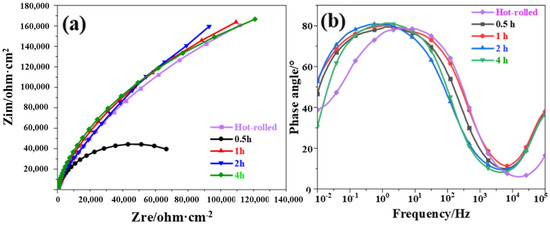 Since an equivalent circuit is used in order to determine the simulated values and compare them with experimental data, a CNLS (complex non-linear least squares) simulation is used, as previously reported [24,25,26] was carried out. Figure 14a is the Nyquist diagram of TA10 alloy in 3.5% NaCl after annealing at 780 °C for different annealing times. It can be seen from Figure 14a that TA10 alloy exhibits a typical single capacitor-reactance arc after being annealed at different annealing times. Therefore, all the oxide film structures on its surface are monolayer structures, which is caused by the formation of highly stable and compact oxide film on its surface [15]. According to the comparison in Figure 14a, the impedance map radius of TA10 alloy is the largest when the annealing process is 780 °C × 4 h, and the impedance map radius of TA10 alloy is the smallest when the annealing process is 780 °C × 0.5 h. This phenomenon is probably due to the difference in the microstructure of TA10 alloy after annealing at different temperatures, which is mainly manifested in the change of α and β phase content and grain size. Figure 14b shows the Bode diagram of TA10 alloy after hot rolling and annealing treatment at different annealing temperatures. As can be seen from Figure 14b, when the annealing process is 780 °C × 4 h, its phase angle is 81.3°, showing the best corrosion resistance. The phase angle is 79.4° when the annealing process is 780 °C × 0.5 h, showing the worst corrosion resistance. The phase angle of TA10 alloy at 780 °C × 1 h and 780 °C × 2 h is between the first two, 80.6° and 80.8°, respectively, indicating that the longer the annealing time, the better the corrosion resistance. The phase angle of TA10 alloy under different annealing times at 780 °C has only one peak, indicating that the surface of TA10 alloy is a single electric layer structure. The model curves in its Bode diagram are smooth and stable, with no obvious fluctuation in slope. The oxide film on its surface is uniform, compact, and complete, basically free of defects. This proves that when the annealing temperature is 780 °C, the corrosion process is uniform even if the annealing time is different.